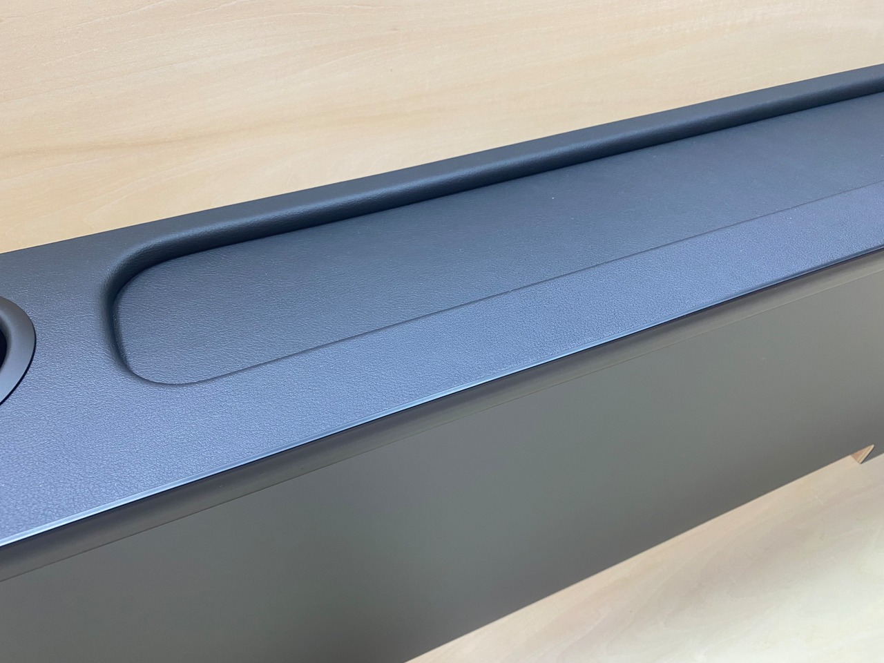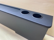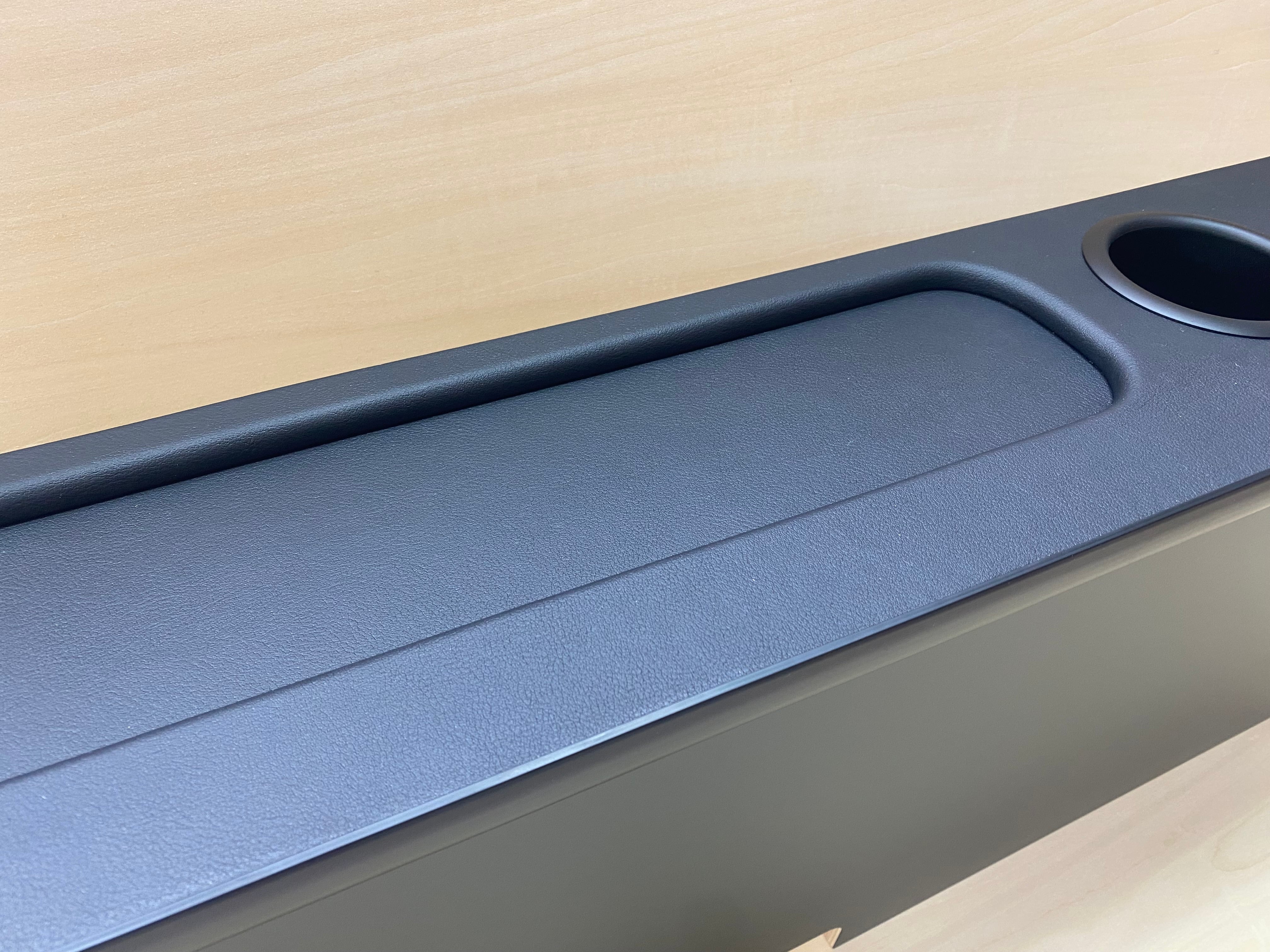 天板仕上げはメラミン化粧板、天板小口は樹脂のTモールを回しています。下パネルはポリ合板です。天板のメラミン化粧板はプロが造作家具で使う素材で、摩擦や水、耐久性にも優れています。