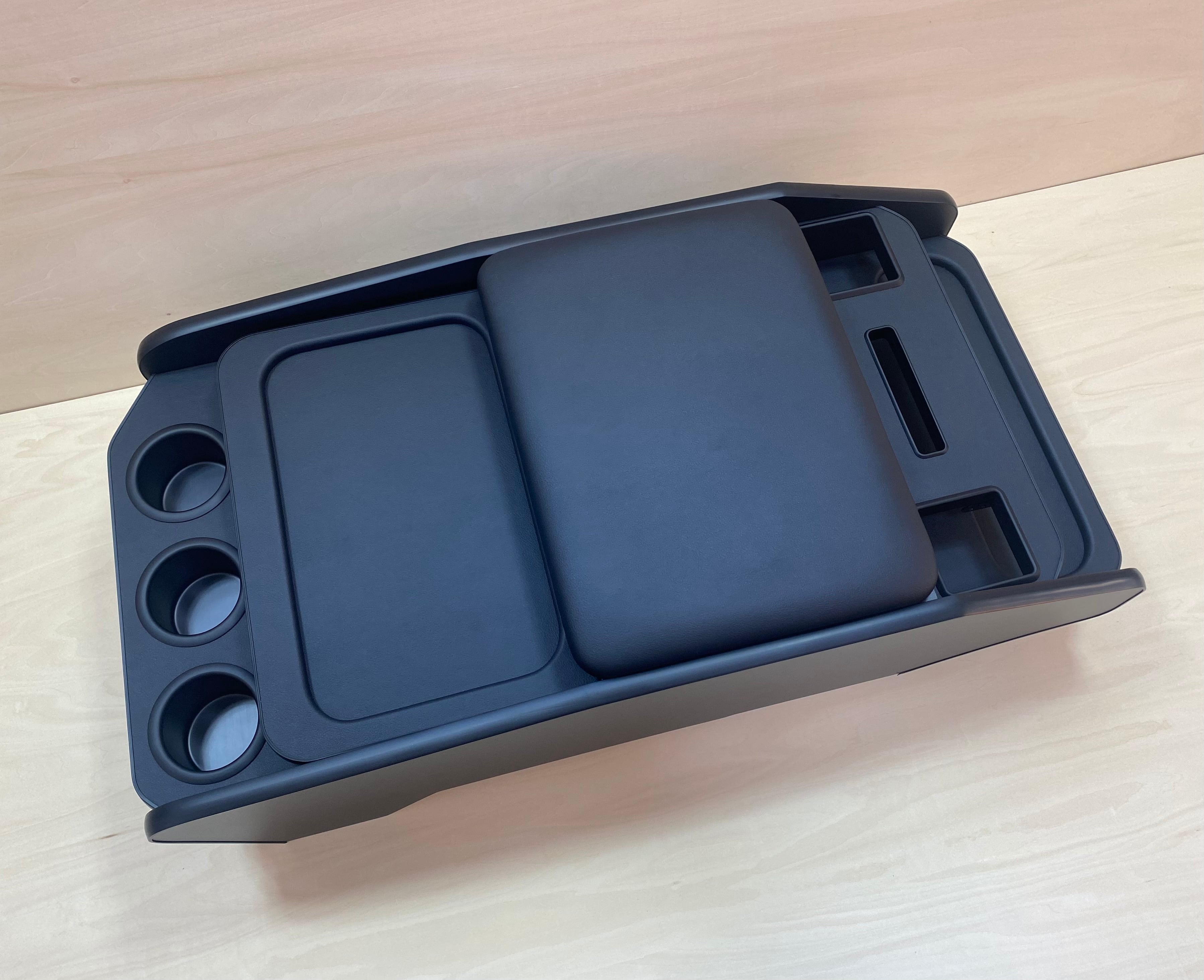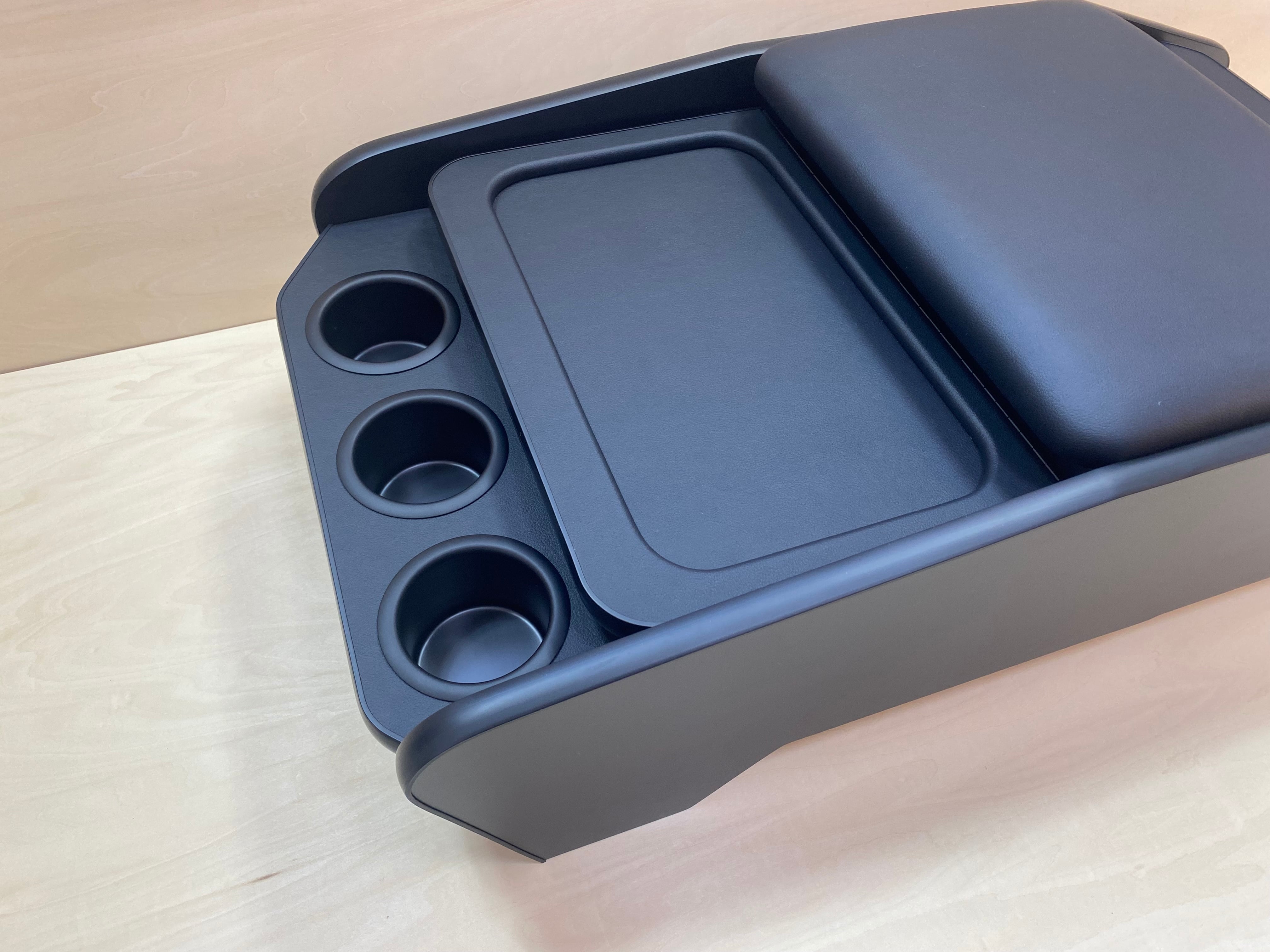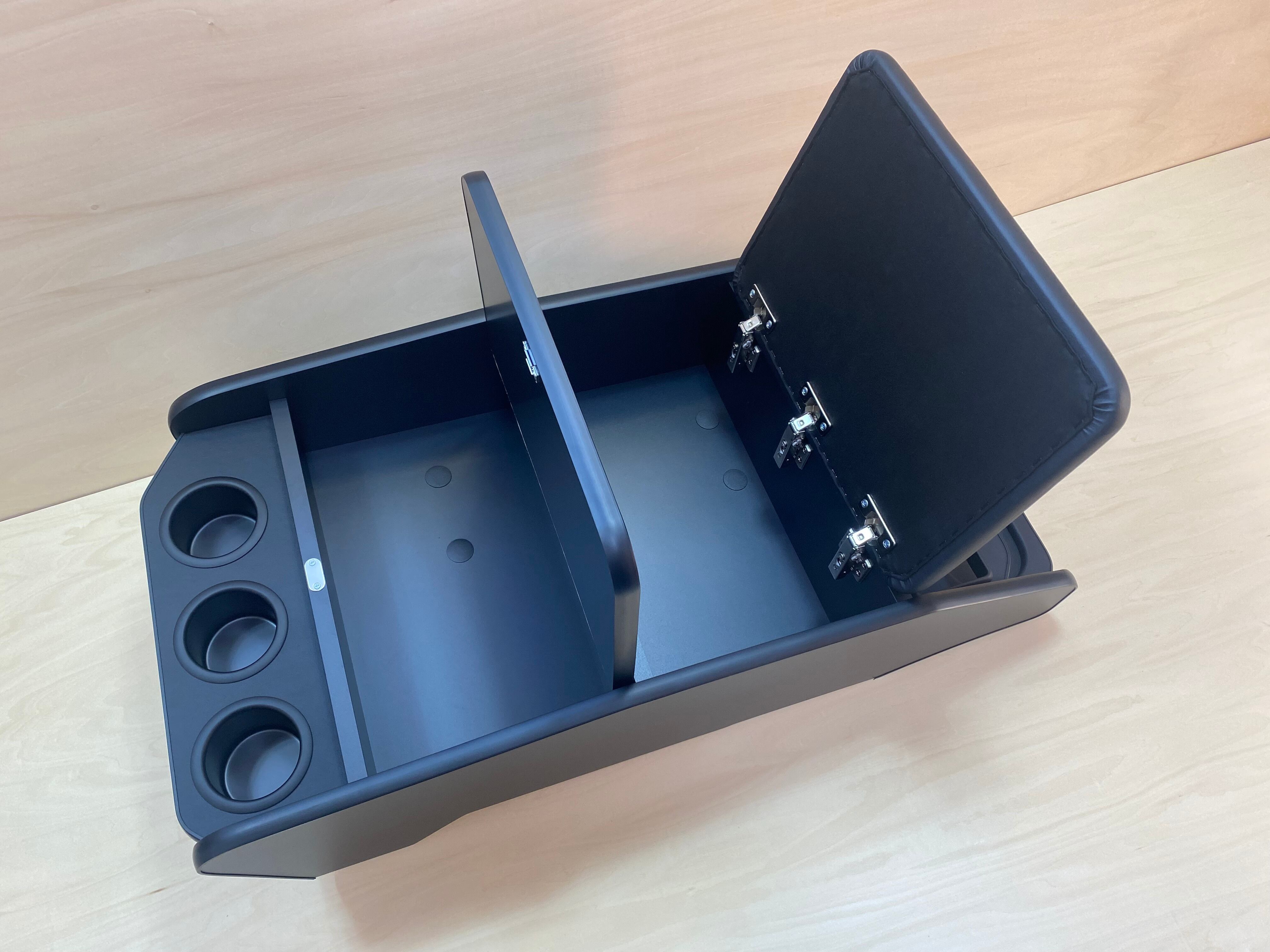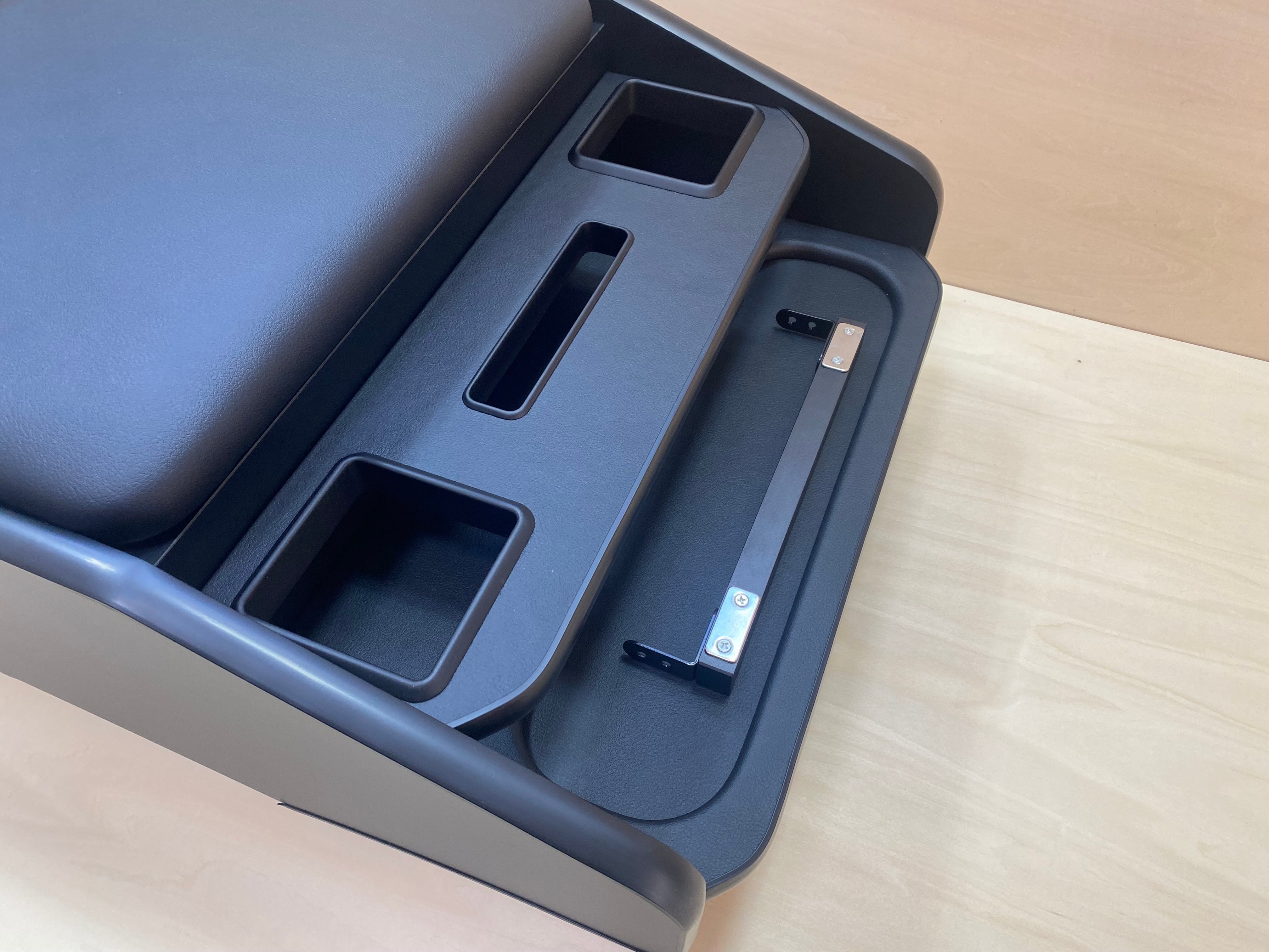 テーブル、クッション部分はレザー生地張り込み、カップホルダーはブラックアルミ製、本体は、内側はポリ合板、外側面はメラミン化粧板での制作になります。材質に耐久性がありますので劣化してみすぼらしくなる事も少ないです。