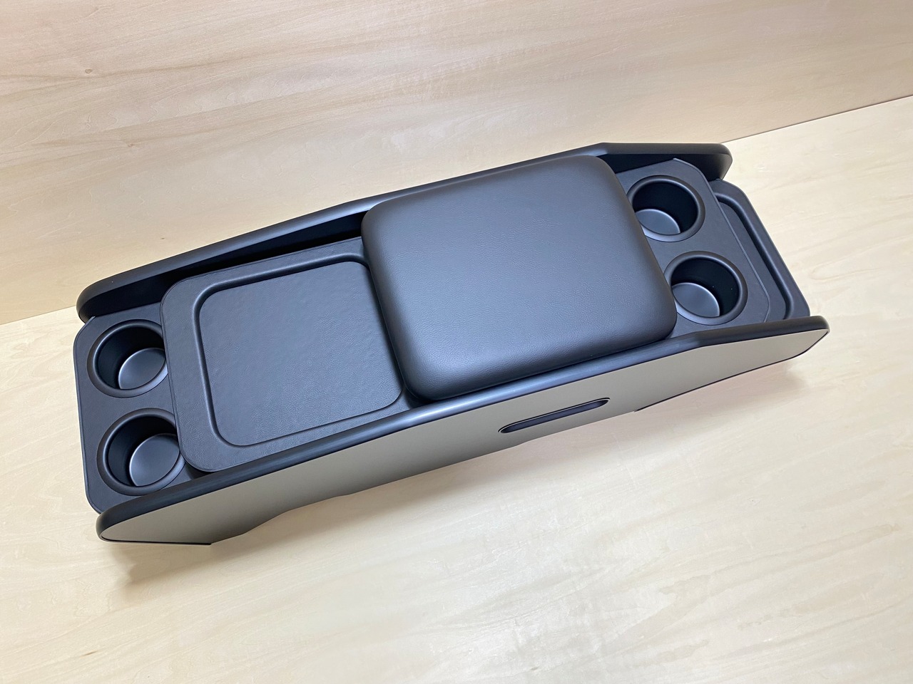 テーブル、クッション部分はレザー生地張り込み、カップホルダーはブラックアルミ製、本体は、内側はポリ合板、外側面はメラミン化粧板での制作になります。材質に耐久性がありますので劣化してみすぼらしくなる事も少ないです。