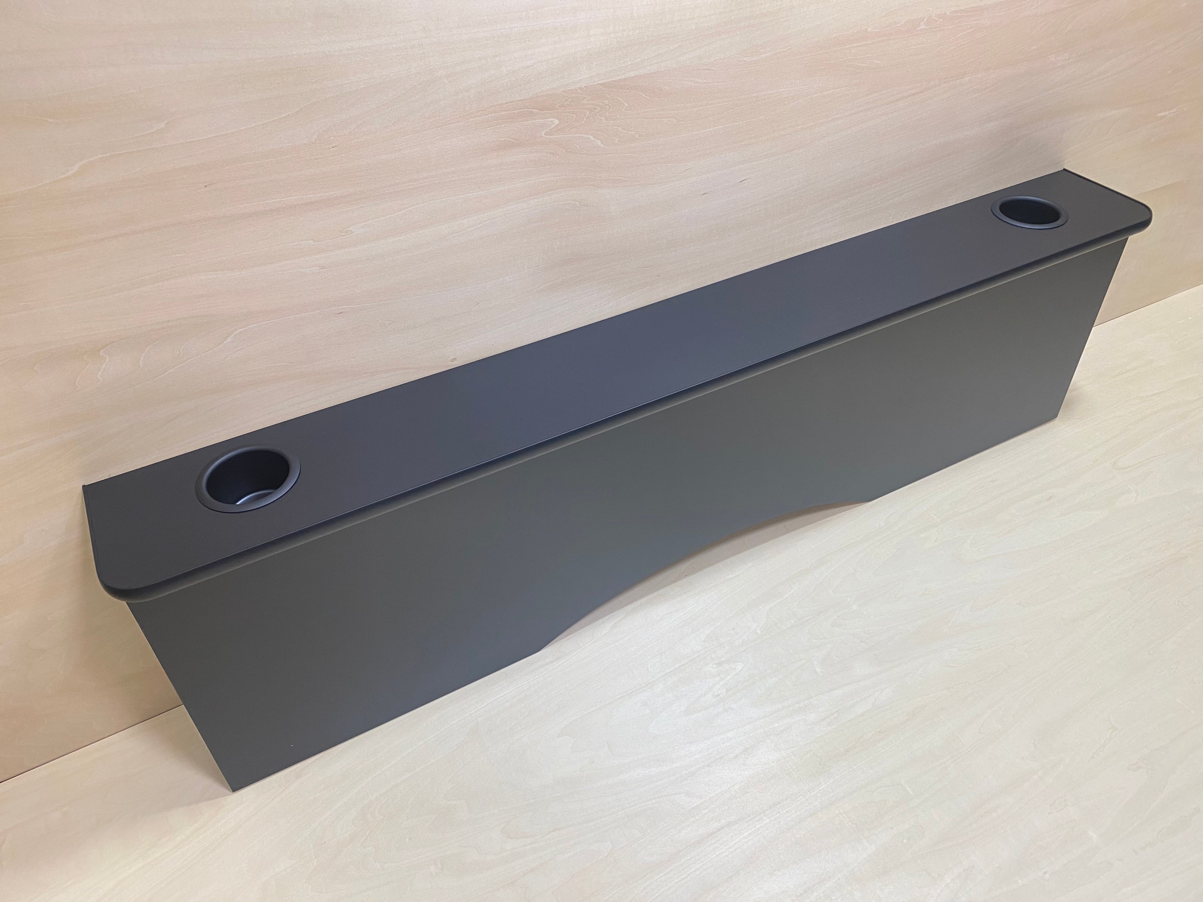天板仕上げはメラミン化粧板、天板小口は樹脂のTモールを回しています。下パネルはポリ合板です。天板のメラミン化粧板はプロが造作家具で使う素材で、摩擦や水、耐久性にも優れています。
